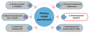 V době klesající porodnosti je naléhavé akcentovat vztah mezi dostupností bydlení a rozhodnutím k rodičovství. Zajištění vhodného či samostatného bydlení je mladými lidmi pokládáno za jednu z nutných materiálních podmínek pro rodičovství. Nedostupnost pro mladé rodiny je hodnocena jako nejméně uspokojivý výsledek podpory rodin v ČR (Paloncyová et al., 2021). Situace v bydlení může hrát i nečekanou roli - mladí lidé žijící ve vlastnickém bydlení plánují děti nejméně ze všech. Rodičovství může být pro lidi v jiném než vlastnickém bydlení životní kotva, kterou dosáhnou alespoň nějaké jistoty (MUNI, 2024). Horší finanční dostupnost bydlení vede přímo úměrně k vyššímu průměrnému věku matek při porodu prvního dítěte, přičemž časování porodů je finanční dostupností bydlení ovlivněno více než úhrnná plodnost (Kostelecký & Vobecká, 2011).