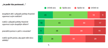 Možnost řešení představuje mezigenerační pomoc, tu ovšem nemá k dispozici každý. Názory Čechů na vzájemné povinnosti finanční pomoci mezi generacemi nejsou jednotné, ačkoliv převažuje ochota si v rámci rodiny pomáhat. Jak z grafu níže vyplývá, ve společnosti výrazně převažuje vnímání povinnosti dospělých dětí pomoci rodičům před pomocí rodičů dospělým dětem.