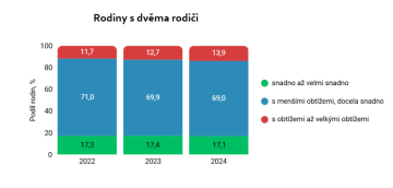 Ačkoliv v roce 2023 vzrostly čisté peněžní příjmy českých domácností o 7,2 %, reálně ale domácnosti kvůli vysoké inflaci o více než 3 % zchudly. Negativní dopady se meziročně nejzávažněji projevily u rodin dvou rodičů s dětmi, kde příjmy meziročně reálně klesly o 6,5 %. Ze subjektivního hodnocení rodin vyplývá růst počtu rodin, které obtížně vychází se svým příjmem: