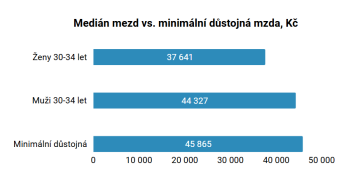 V tomto věku, tedy mezi 30 a 34 lety, kdy se ženy i muži nejčastěji stávají rodiči, mají ženy průměrnou mzdu 42 039 Kč, medián je 37 641 Kč. Muži ve stejné věkové skupině mají průměrnou mzdu 49 861 Kč a medián 44 327 Kč (ČSÚ, 2024). Přitom minimální důstojná mzda, kterou vypočítali odborníci z Platformy pro Minimální důstojnou mzdu (2025), činí 45 865 Kč měsíčně. Tato částka představuje hranici umožňující vést běžný život, cítit se jako plnohodnotný člen společnosti a zároveň zajistit péči o jedno dítě. V Praze a Brně pak činí minimální důstojná mzda dokonce 53 953 Kč.