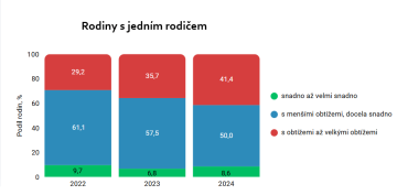 Pozornost si zaslouží i podíl domácností, které vychází se svými příjmy bez potíží - opravdu jich není velký podíl. Mezi domácnostmi se dvěma rodiči jich je šestina a mezi rodinami s jedním rodičem dokonce méně než desetina. (Dvornáková & Měřinská, 2025)