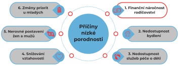 V Česku klesá porodnost, v roce 2024 se narodilo nejméně dětí od dob vlády Marie Terezie (ČSÚ, 2025). Kde hledat příčiny? Ve veřejném prostoru i mezi odborníky se hovoří o obvyklých podezřelých, viz diagram: