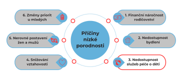 V Česku klesá porodnost (ČSÚ, 2025) a my v této sérii článků zkoumáme obvyklé faktory, které mohou být na vině - viz diagram níže. V tomto článku se zaměříme na služby, které rodiny potřebují a jejichž absence zvyšuje náročnost péče o děti a ztěžuje zapojení do práce.