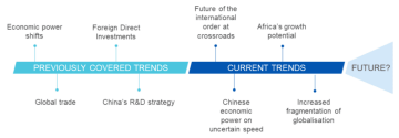 - Zvyšující se fragmentace globalizace - Po finanční krizi v letech 2008–2009 došlo ke zpomalení fáze hyperglobalizace. Strategická autonomie států, populistický nacionalismus a selhávání vysoce provázaných globálních dodavatelských řetězců vedly k větší fragmentaci globalizace. V budoucnosti bude mezinárodní obchod více zaměřen na regionální obchodní bloky a spolupráci mezi podobně smýšlejícími partnery. Tento proces povede ke vzniku multipolárního světa, kde propojování a integrace zůstanou důležitými pilíři, ale sbližování na globální úrovni bude omezené.