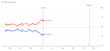 Během posledního měsíce zveřejnily své (průběžně upravované) predikce výsledku amerických prezidentských voleb hned dvě renomované instituce. The Economist nyní odhaduje, že Donald Trump má 68% pravděpodobnost vítězství, zatímco Joe Biden pouze 31% (obojí k 21. červnu).