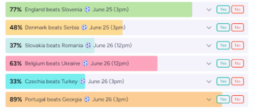 Pro jednou se za zajímavou otázkou (či spíše setem otázek) podíváme za predikčními trhy - konkrétně na Manifold Markets. Přiznám se bez mučení, že sám sport příliš poctivě nesleduji, ale věřím, že se takoví mezi čtenáři najdou. Na Manifoldu forecasteři v rámci jediné otázky řeší většinu zápasů Evropského šampionátu ve fotbalu. Napsal bych, ať vyzkoušíte vsadit podle forecasterů abyste zhodnotili, jak jsou dobří, ale nechci vás nabádat ke gamblingu. Pro patrioty mám každopádně špatnou zprávu - forecasteři dávají ČR pravděpodobnost vítězství nad Tureckem (datum) aktuálně pouze 33 %. Mimochodem, u otázky nejsou povolení boti, kteří jsou jinak na Manifoldu téměř všudypřítomní.