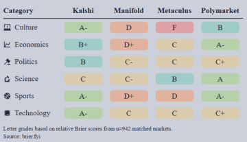 V posledních letech je snaha lépe měřit a srovnávat přesnost různých forecastingových platforem, jednou z podobných iniciativ je web brier.fyi, který podobné srovnání nabízí u binárních a multiple choice otázek položených na Metaculu, Polymarketu, Manifoldu a Kalshi. Z dat mimojiné vychází, že komunitní predikce u 62% otázek se již jeden měsíc před vyhodnocením měly odchylku od správného výsledku menší než nebo rovnu 30 %.