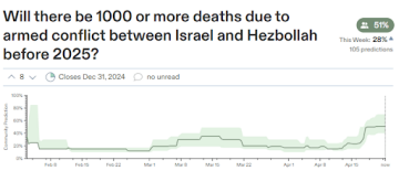 Vzhledem k dynamickému vývoji situace na Blízkém východě se tentokrát s výběrem otázky zaměříme právě tam. Na Metaculu v tomto týdnu vzrostla predikce toho, zda do konce letošního roku zemře v konfliktu mezi Izraelem a Hizballáhem více než 1000 osob, o celých 28% (na 51%) Pravděpodobně to souvisí s eskalací vztahů mezi Izraelem a Íránem, ale také jedním posledních útoků Hizballáhu, ve kterém bylo zraněno 14 izraelských vojáků.