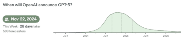 Jedna z velmi populárních otázek na platformě Metaculus je to, kdy bude oznámen nový model generativní umělé inteligence GPT-5. Přejdeme-li technikálie (např. problematiku pojmenovávání modelů), podle téměř 600 forecasterů se na nový model můžeme těšit již na podzim letošního roku..