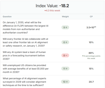 Forecastingová platforma Metaculus na konci ledna letošního roku oznámila, že pracuje na vývoji nových instrumentů, Indexů, které jsou určené především pro publikum mimo forecastingovou komunitu. Indexy mají vždy konkrétní zaměření a skrz k nim přiřazené otázky s patřičnou váhou získávají svou vlastní hodnotu. Metaculus na tvorbě prvních z nich spolupracuje se Simon Institute for Longterm Governance (téma - China AI Capabilities) a organizací AI Palace (téma - AI for Public Good). Na konci listopadu 2024 pak účastníci konference The Curve vybrali otázky, které tvoří tzv. AGI Readiness Index, který se zaměřuje na hodnocení toho, jak daleko jsme v přípravách na příchod AGI (regulatorně, technologicky, společensky, …). Vyšší hodnota indexu značí větší připravenost, nižší naopak.