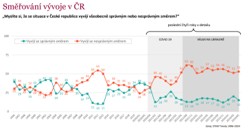 V úvodu panelu představil Jiří Táborský data z výzkumů STEM, jako je například níže uvedený graf tzv. “blbé nálady”, který ilustruje spokojenost s vývojem v ČR – pouze 15 % respondentů je přesvědčených, že směřujeme správným směrem, roste také křivka nespokojenosti.