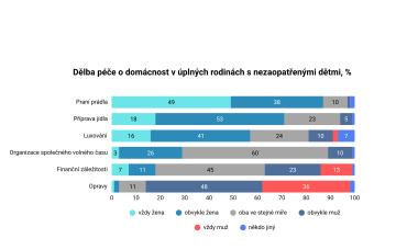 V očekávání dělby péče o domácnost a péče o děti se bezdětní muži a ženy liší téměř o 10 %. Až 69 % žen si myslí, že by se ženy a muži měli rovně dělit o péči o děti. Tento názor má jen 60 % mužů. U péče o domácnost jsou podobné rozdíly (67 % žen a 60 % mužů). Očekávání a praxe se tak velmi liší (Paloncyová et al., 2021).