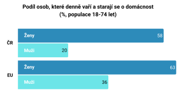 Nedostatečné služby péče o děti a jejich vliv na porodnost jsme popsali v předchozích článcích o porodnosti na našem blogu. V EIGE indexu (2024) rovnosti je Česko až na úplně posledním místě v poměru času, který věnují ženy vaření a péči o nejbližší k času, který věnují této péči čeští muži.