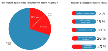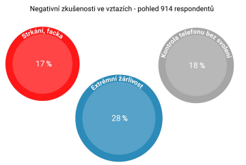 Výzkum mezi mladými lidmi v Česku navíc ukazuje, že mnoho vztahů je již od počátku problematických. Z tisícovky dotázaných ve věku 16–26 let mělo 914 zkušenost s partnerským vztahem, přičemž 30 % z nich zažilo nějakou formu násilí. Nejčastěji šlo o psychologické násilí – například extrémní žárlivost, obviňování z nevěry či nadměrnou kontrolu. Téměř pětina respondentů zažila i fyzické násilí. Nejrozšířenější formou je však tzv. kybernásilí, zejména mezi teenagery – zahrnuje čtení zpráv z mobilu bez svolení, sledování online aktivit či zahlcování zprávami i po ukončení vztahu. Takové zkušenosti mají závažné dopady na psychické zdraví a mohou vést až k myšlenkám na sebevraždu, které uvádí 16 % mladých lidí (ProFem, 2019).