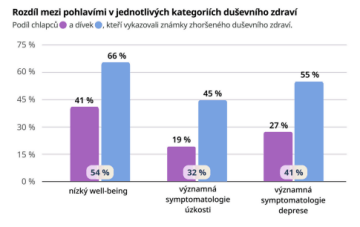 Úroveň duševních potíží, které mladí lidé z různých důvodů zažívají, je navíc naprosto alarmující - více než polovina žáků devátých tříd vykazuje zhoršené duševní zdraví, 40 % vykazuje známky střední až těžké deprese a 30 % úzkosti, přičemž tyto jevy se častěji vyskytují u dívek. Roste také sebevražednost a sebepoškozování (NUDZ, 2023). To je v souladu s celosvětovým trendem - nárůst duševních obtíží je zaznamenáván od roku 2010, přičemž pandemie covid-19, která je často považována za spouštěč, se podle dat jeví jen jako akcelerátor (Schrijvejs et al., 2024).