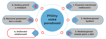 V Česku klesá porodnost (ČSÚ, 2025) alarmujícím způsobem. V této sérii článků zkoumáme nejpravděpodobnější faktory, které mohou současný pokles způsobovat – viz diagram níže. V tomto článku se zaměříme na proměny ve vztazích, trendy v oblasti sexuality a důvody pro odkládání rodičovství do pozdějšího věku.