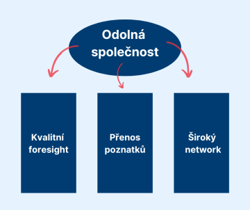 Kvalitní foresight: Mnoho autorů (např. Boyd et al. 2015; Muiderman et al. 2020) zdůrazňuje, že jedna z klíčových složek odolnosti je anticipační vládnutí. Aby společnost byla odolná je nezbytné předvídat možné krize a hrozby budoucnosti. Je důležité, aby společnost jednala preventivně a ne až v reakci na problémy. Pouze v takovém případě se může společnost připravit a adaptovat na budoucí stav, aby nebyla externí hrozbou výrazně změněna a fungovala stále podobným způsobem.